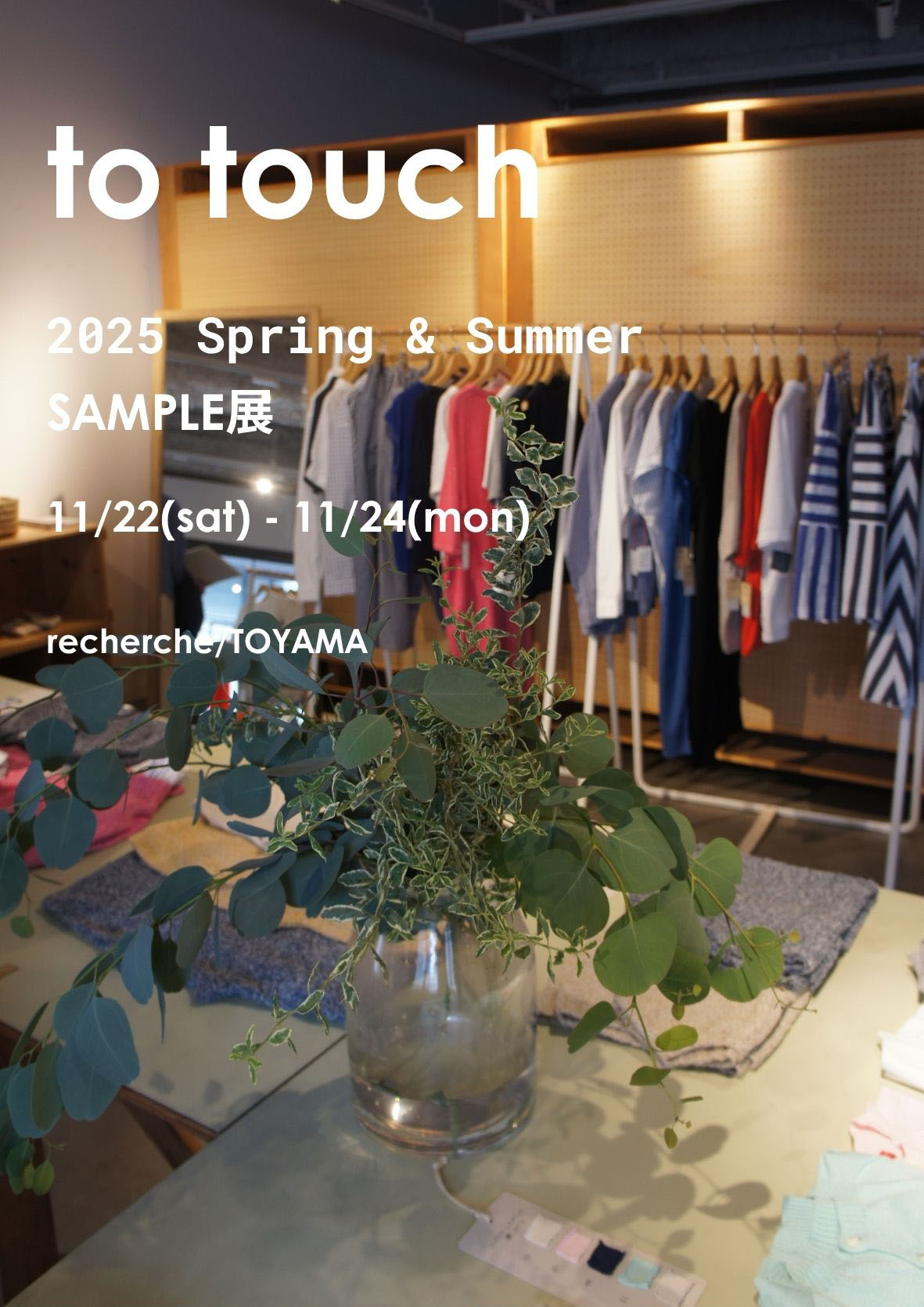 to touch 2026 春夏サンプル展のお知らせ📣 明日からスタート! 期間:11/22(土)、11/23(日)、11/24(月) 今週末の土日月の3日間、to touchの2026年春夏コレクシ…