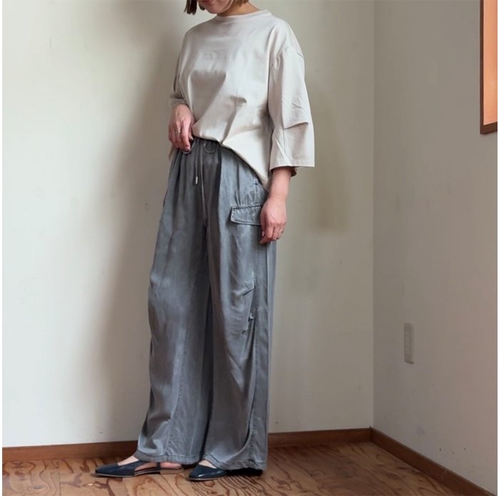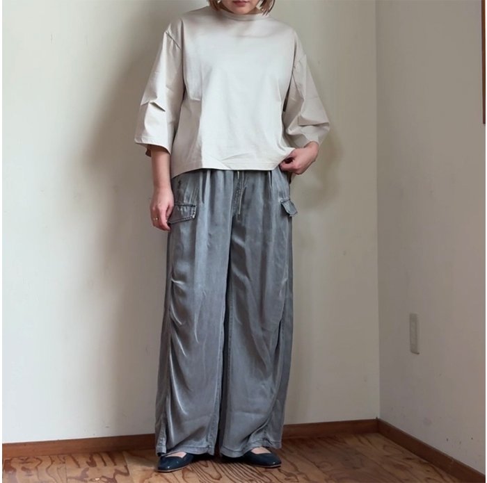 スッキリとした丈感で、トップスインしなくてもスッキリと合わせやすくなっています。