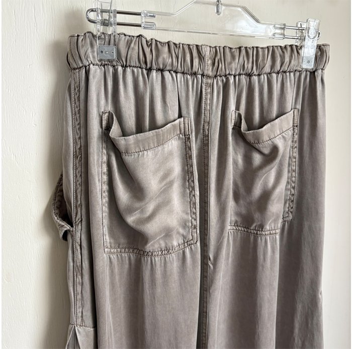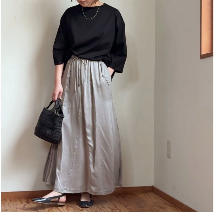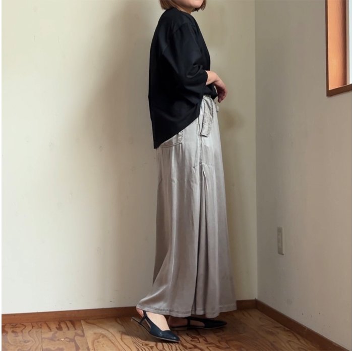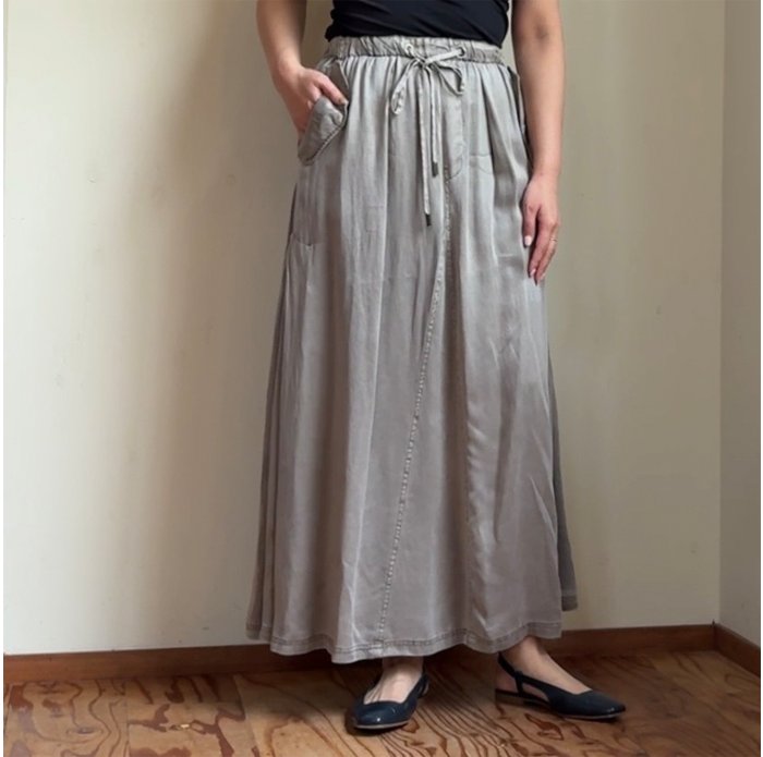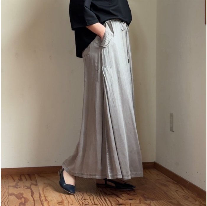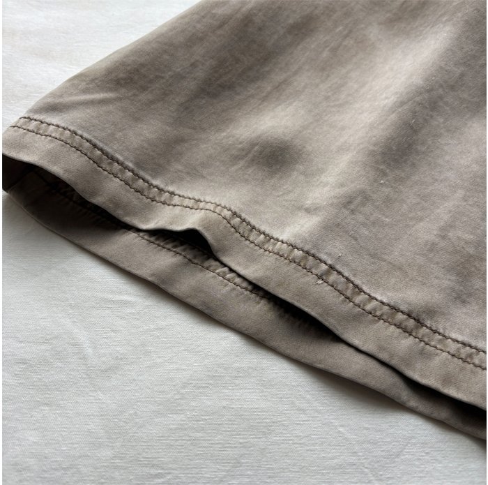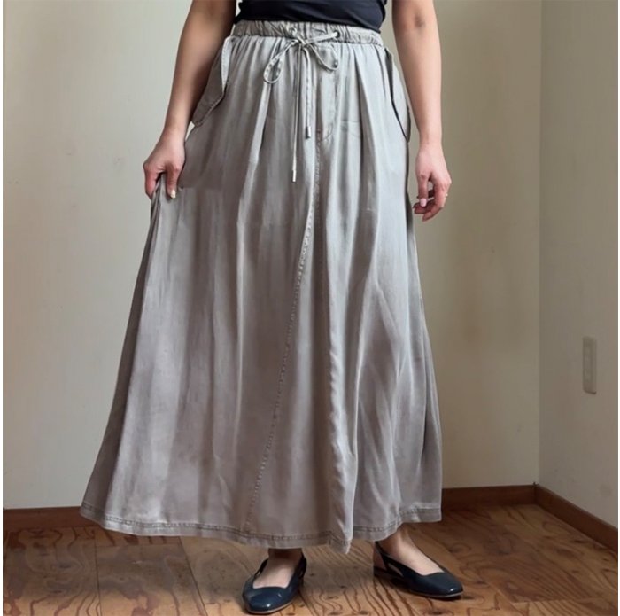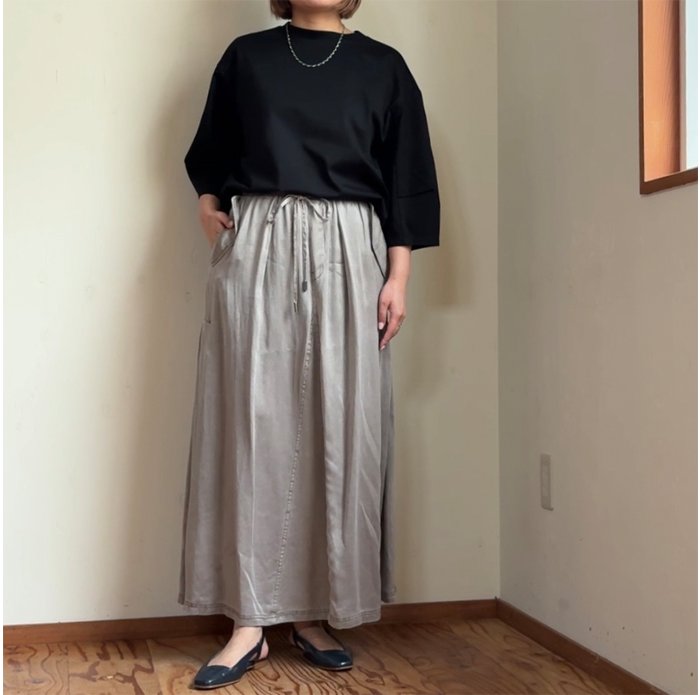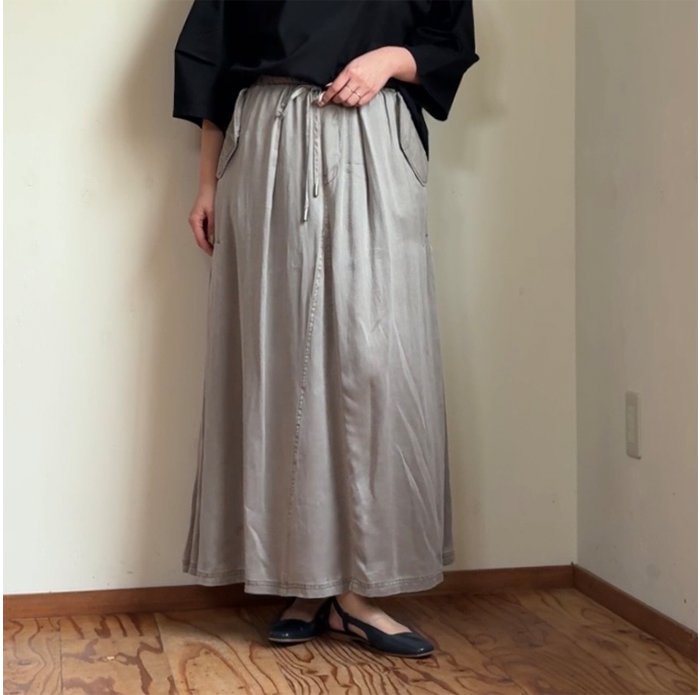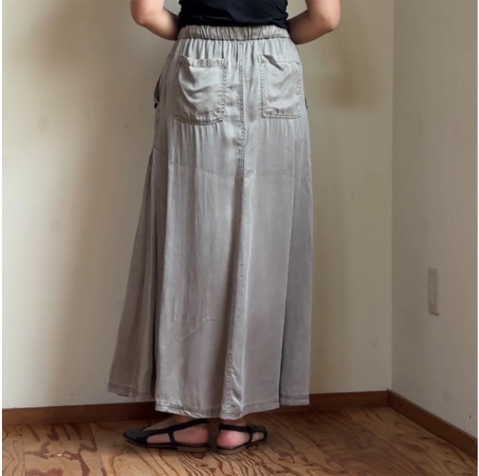 ヴィンテージのような色落ち感、マットな質感、柔らかな風合いが魅力的なピグメントダイ加工のサテン地スカート。
