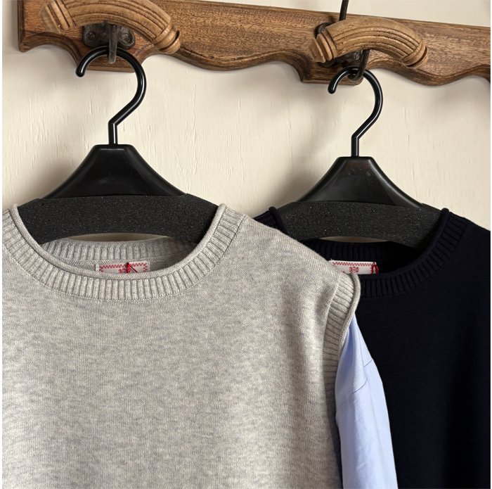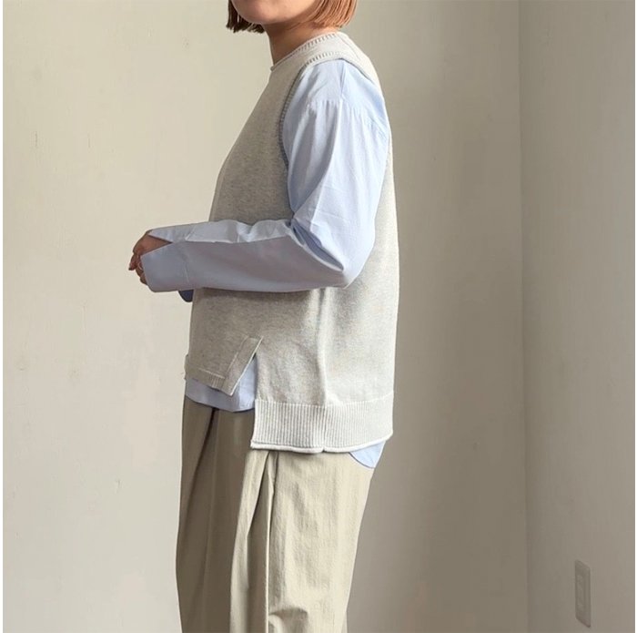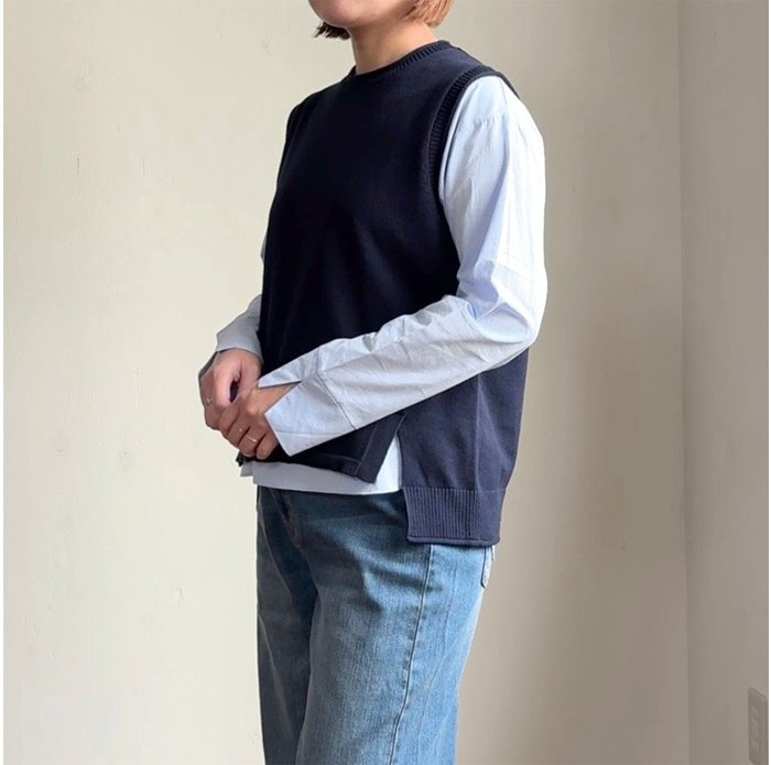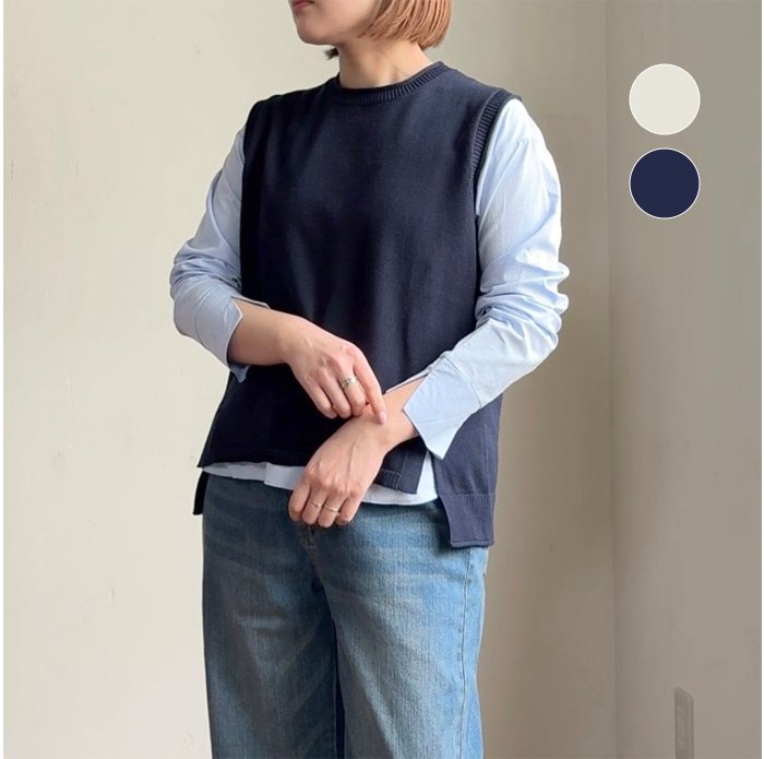 コットン 100%のソフトな風合いの糸を使用した前後差のあるシンプルなニットベストに、カラーのインナーをセットしたお得なシリーズです。