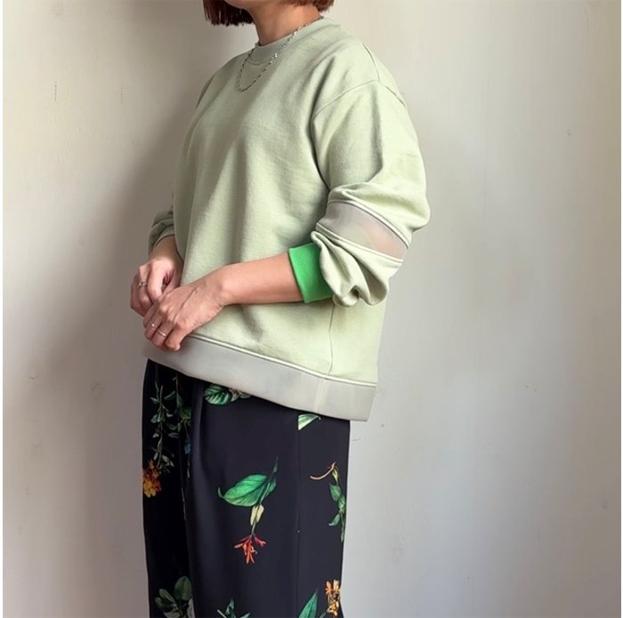 シアー素材をコンビネーションしたフェミニンに着こなせる一枚です。