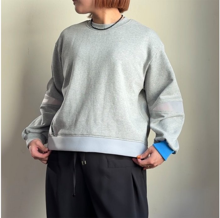 袖肘と裾切替えに、微配色のシアー素材をコンビネーションして、春らしいディテール。