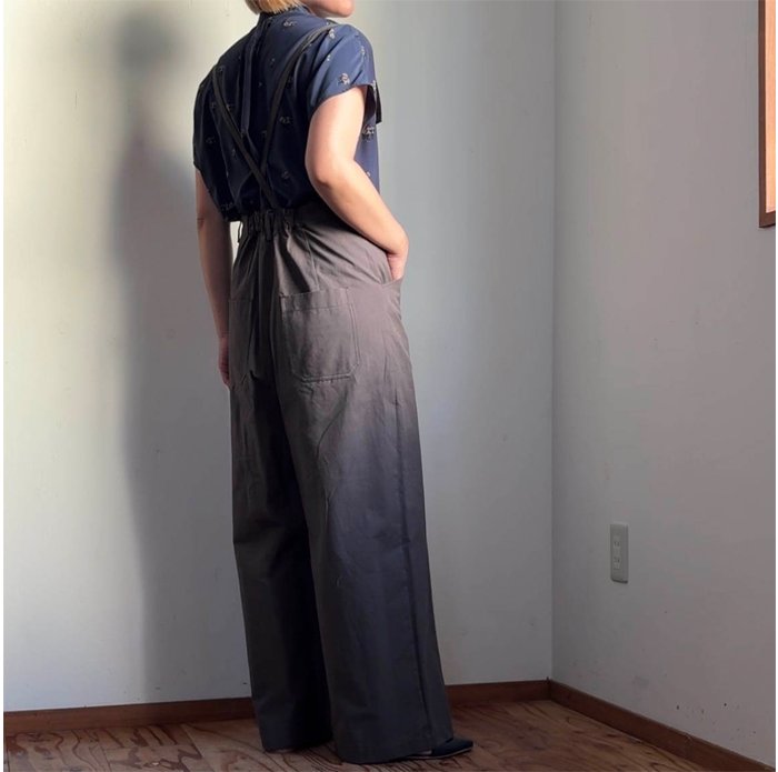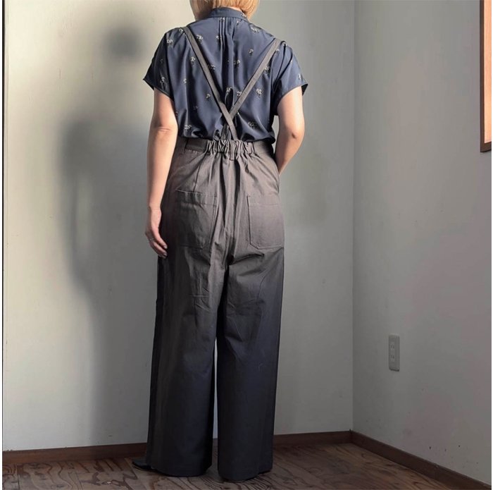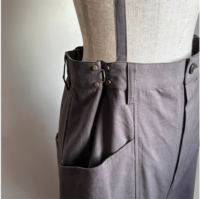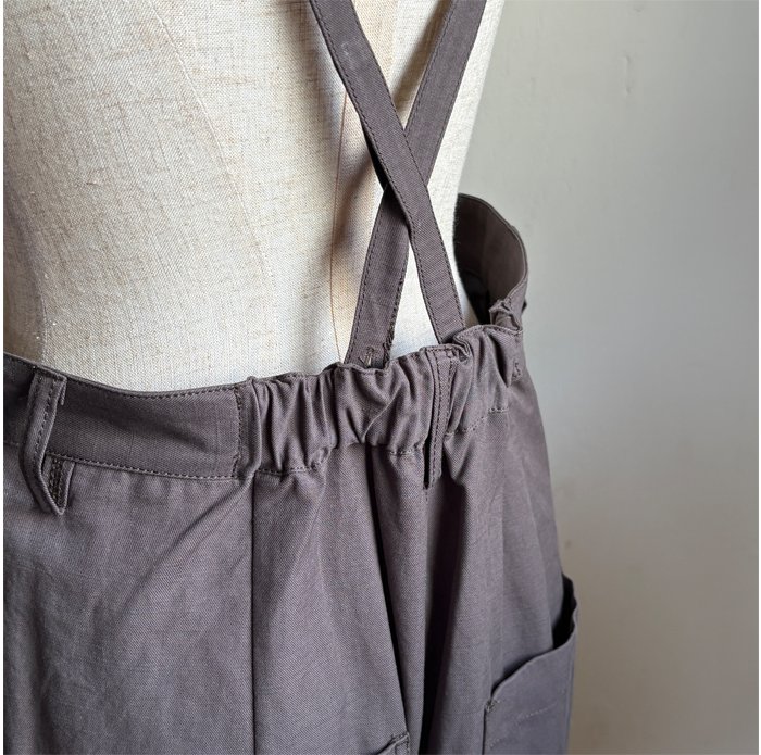 ナチュラルな風合いが魅力のコットンリネンツイルを使用したサスペンダーパンツ。
