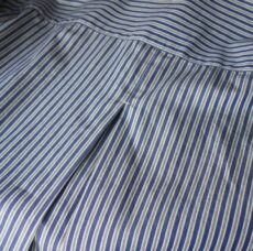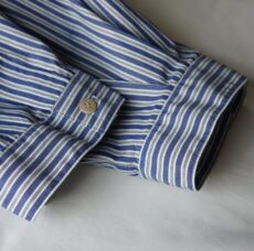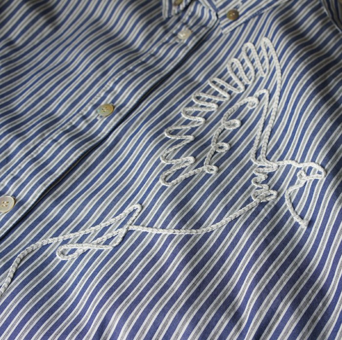 爽やかなブルーストライプに刺繍を施した6分袖シャツ。