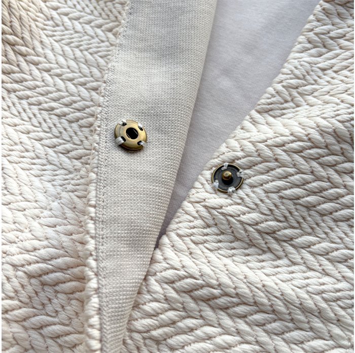 表情豊かなケーブル柄ジャガードをフロントにあしらったショートカーデ。
