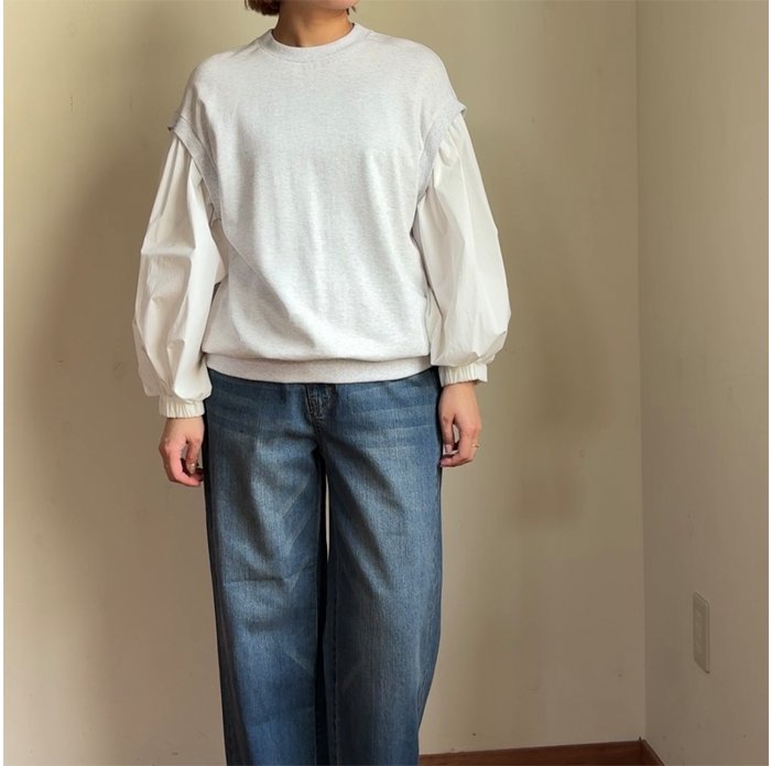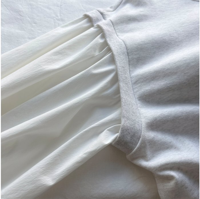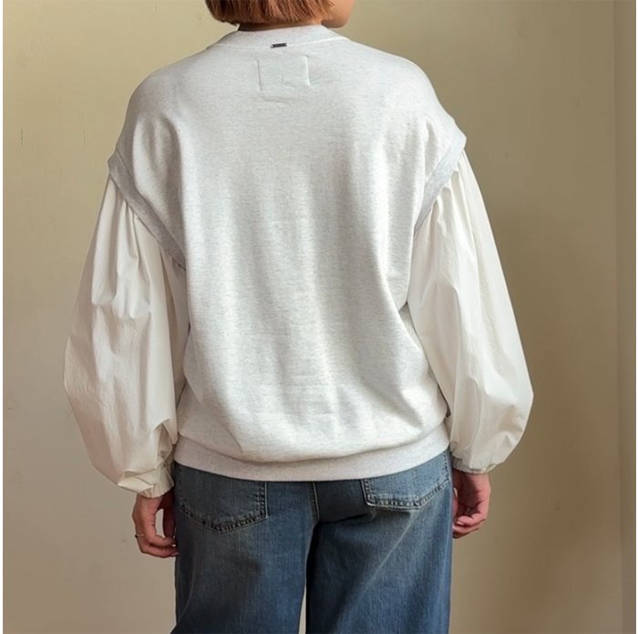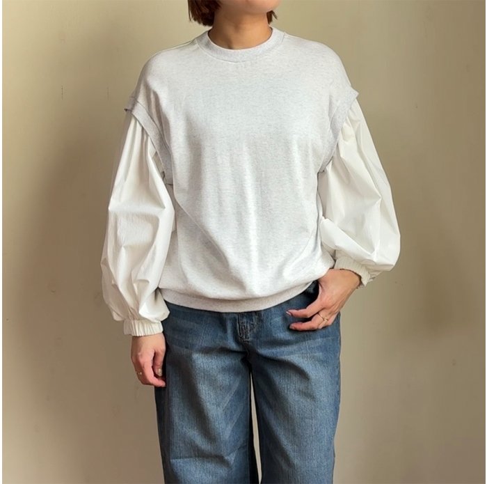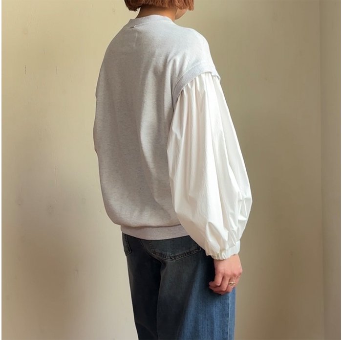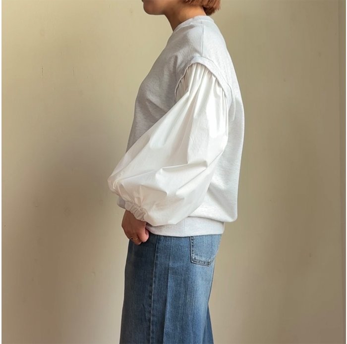 裏毛トレーナー地の身頃に、布帛の生地のボリューム感のある素材で切り替えたプルオーバー。