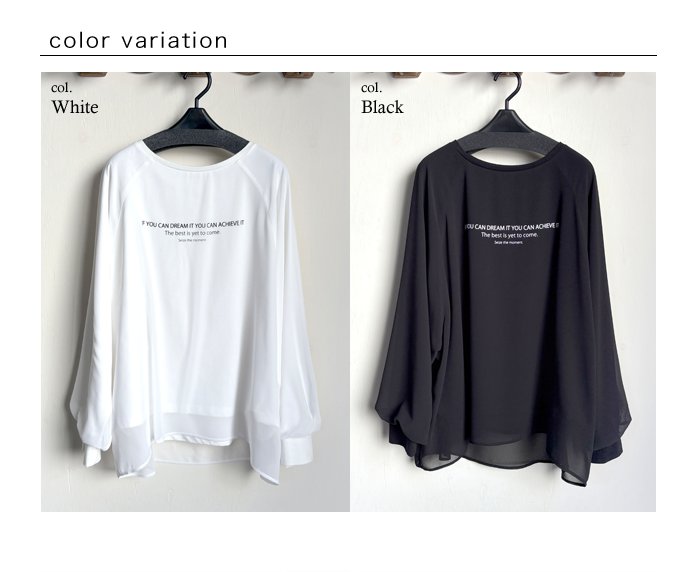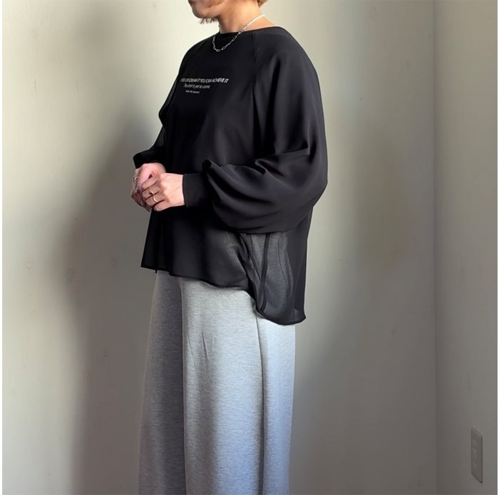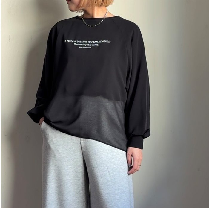 シアーの生地を重ねて、一枚で重ね着しているようなスタイリングが決まるデザインロゴ ロングTee。