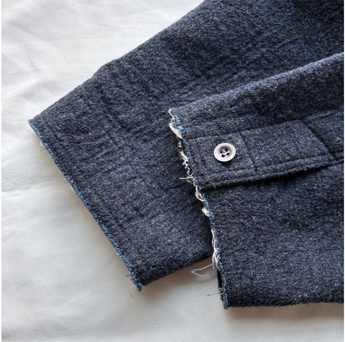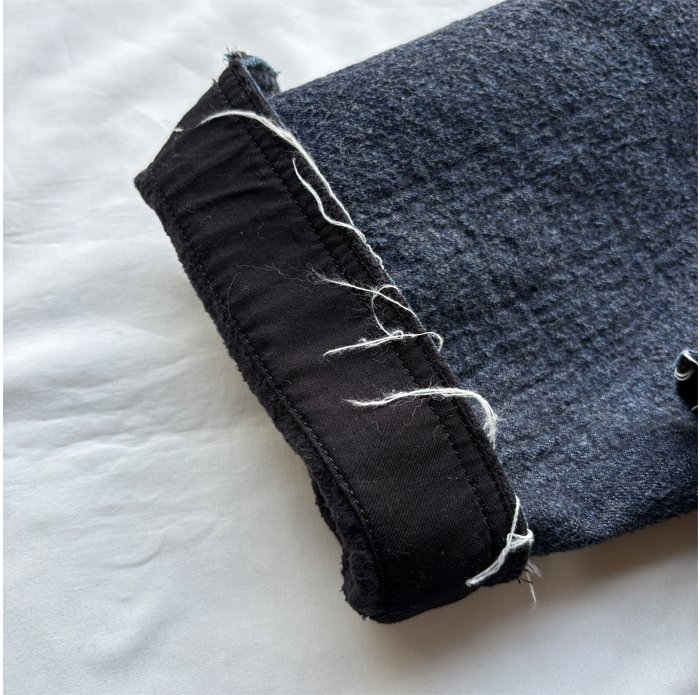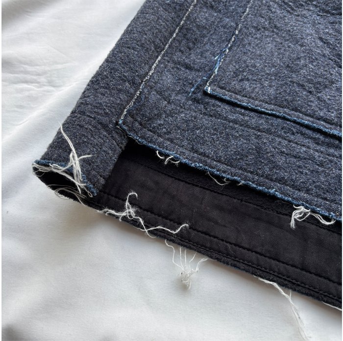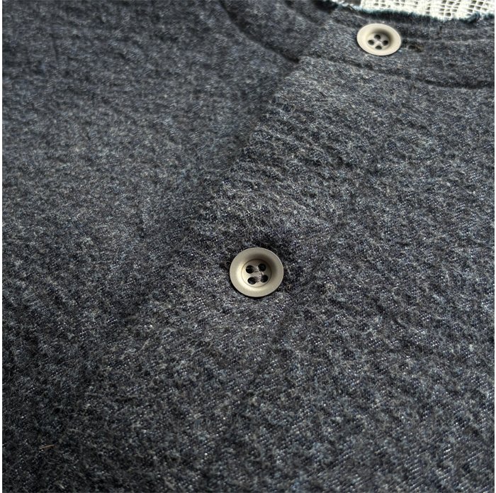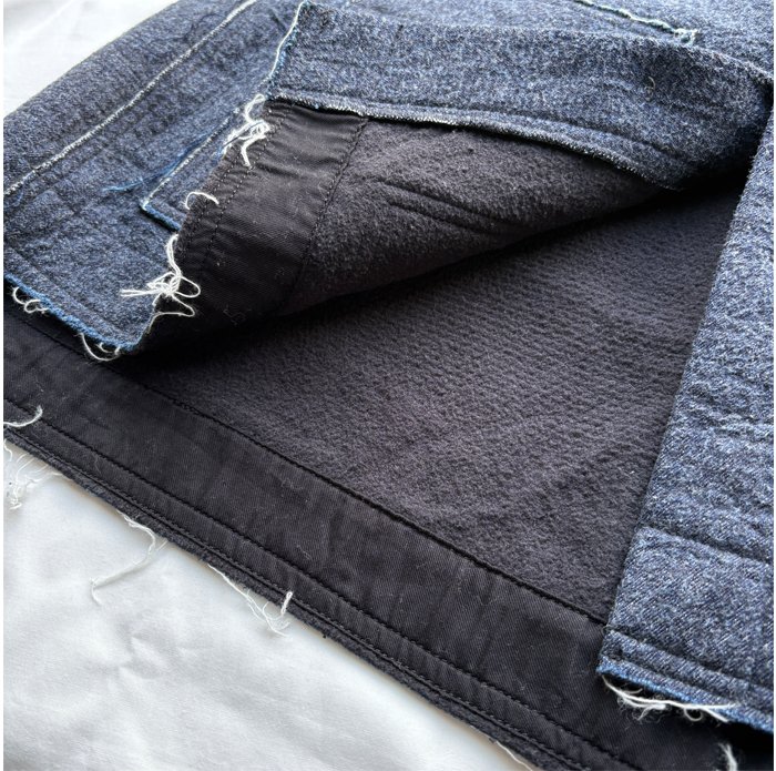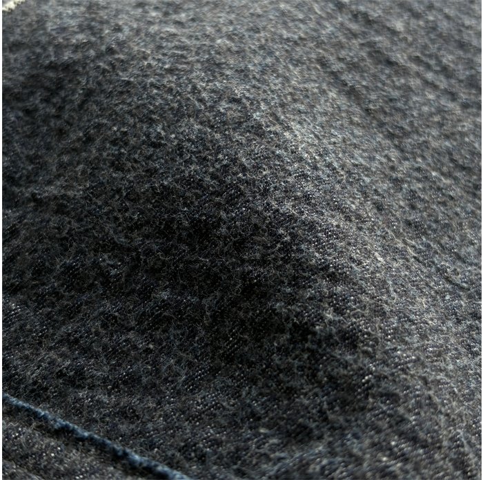 ベージュはリネンコットンのデニム、コンは8オンスのデニムに、それぞれ裏側に肌当たりが非常になめらかであたたかなフリースをニードルパンチしました。