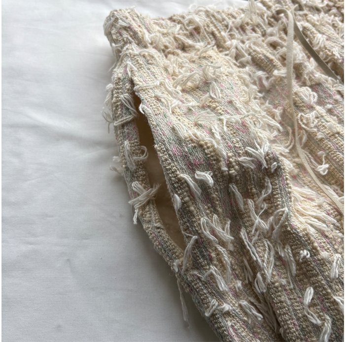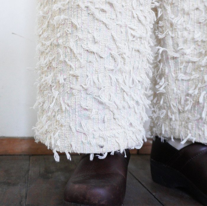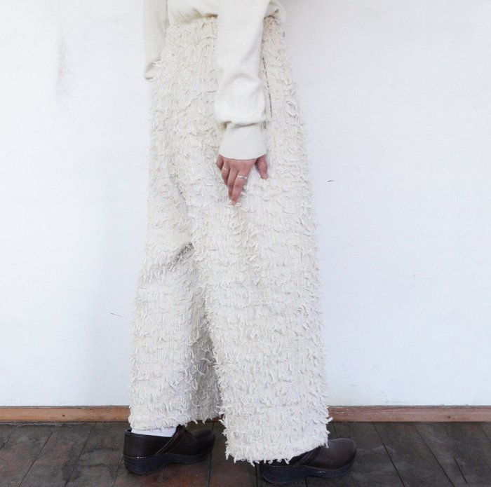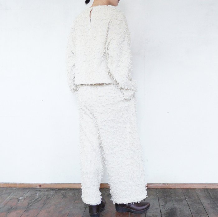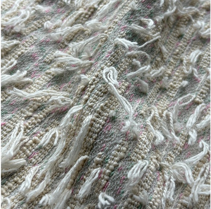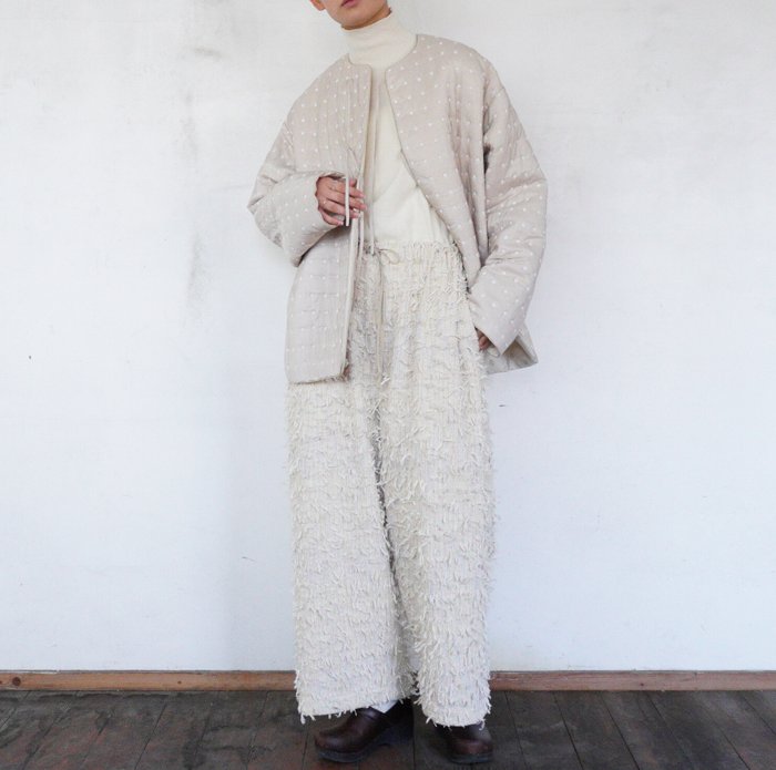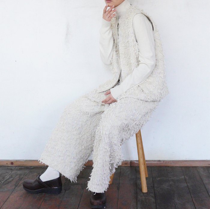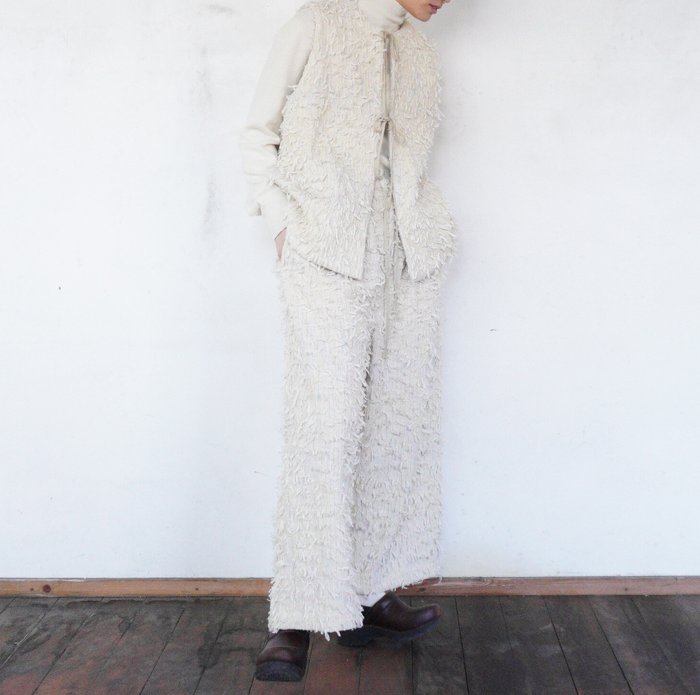珍しい番手の綿糸を使用したカット糸は、あえて長めに不揃いにカットしているので、より奥行感や粗野感のある仕上がりになっています。