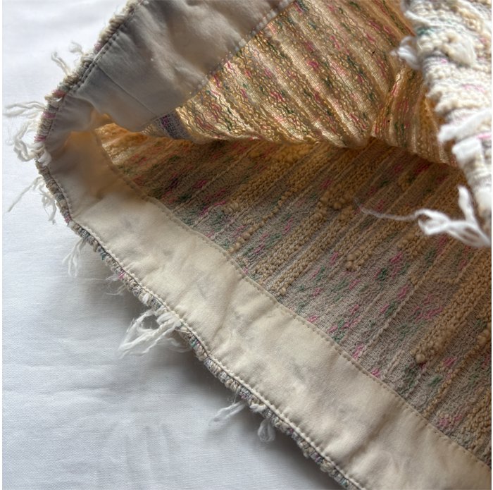 ベースに太い甘撚りのぽこぽことした糸と、光沢やスラブ感のある色糸を、あえて奥行を感じる配置で織り込んでいます。