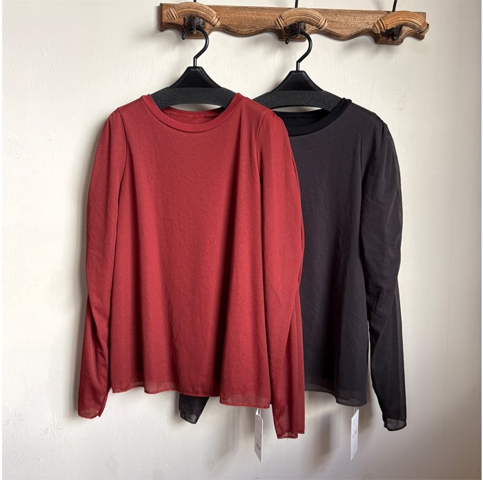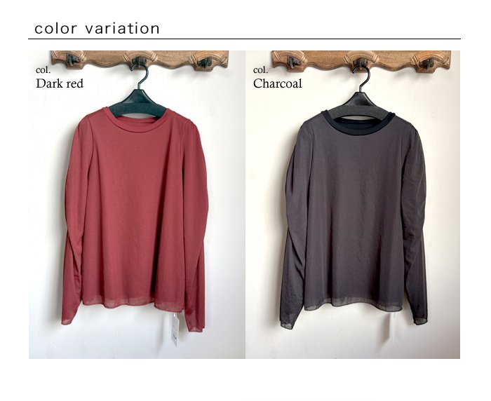カットソー地にシアー生地重ねて、レイヤードしているような一枚で様になるデザインカットソー。