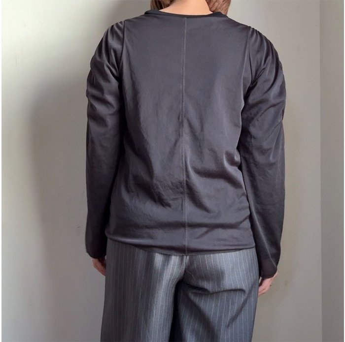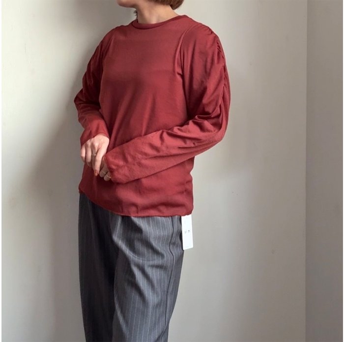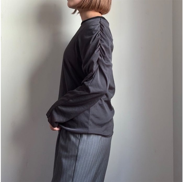 肩部分にギャザーを施し、パフスリーブとは異なる大人なボリューム袖に。