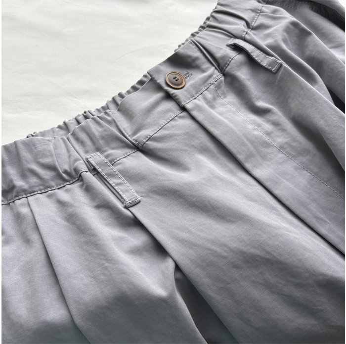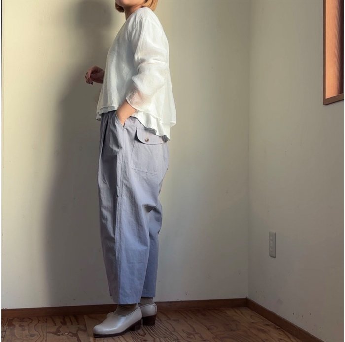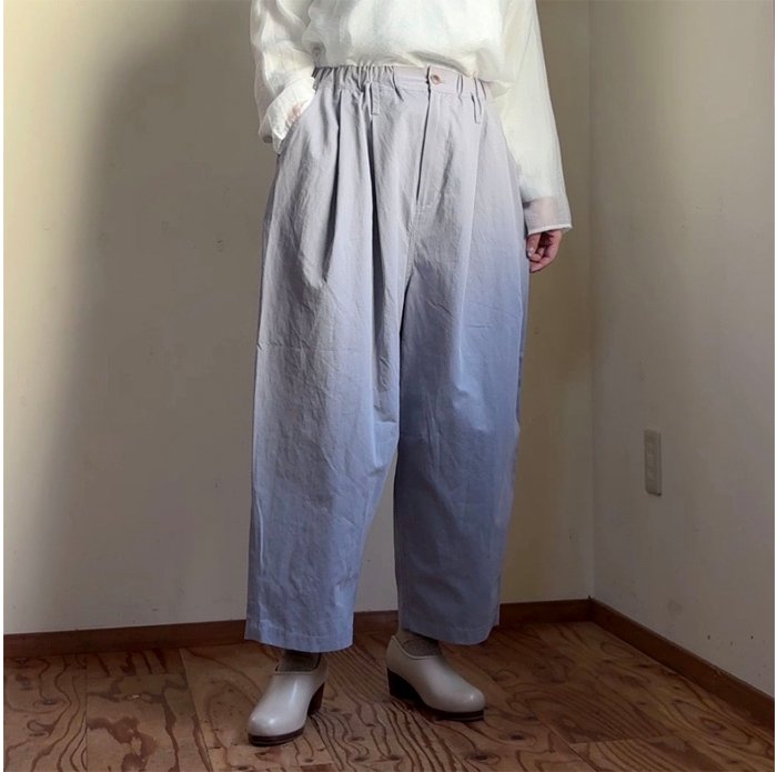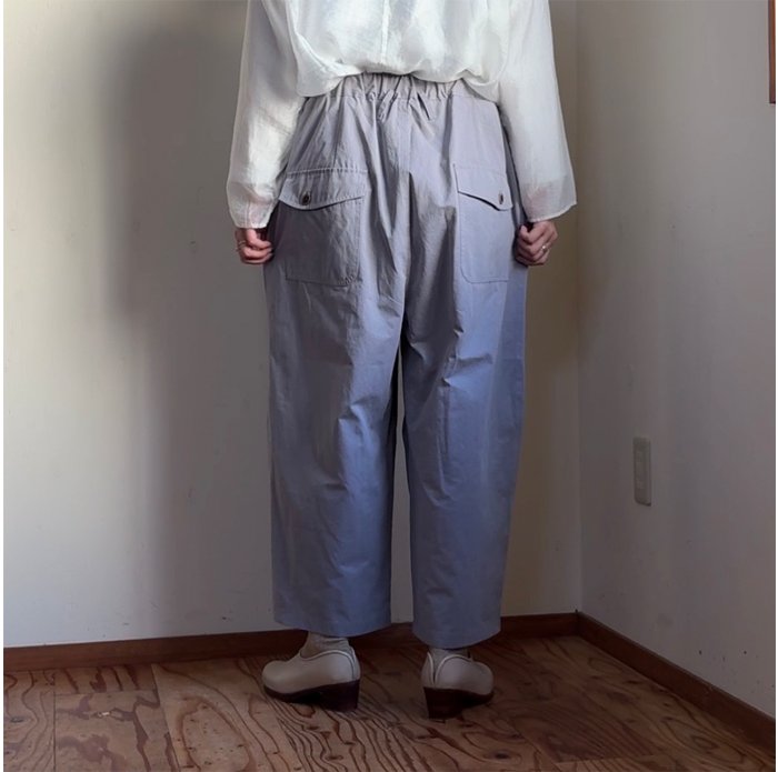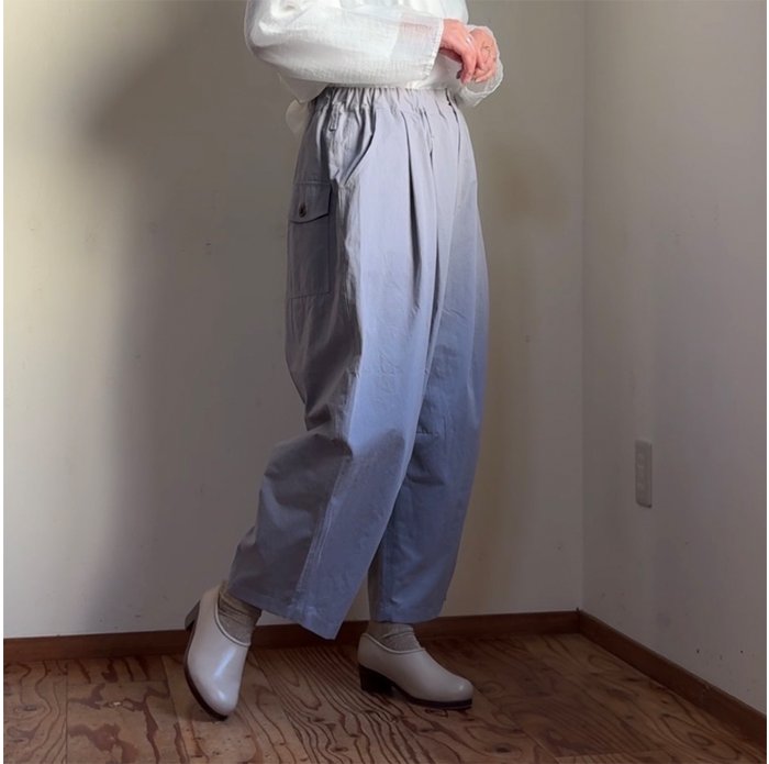 フロントには深めのタックを施し、腰回りはゆったりと。