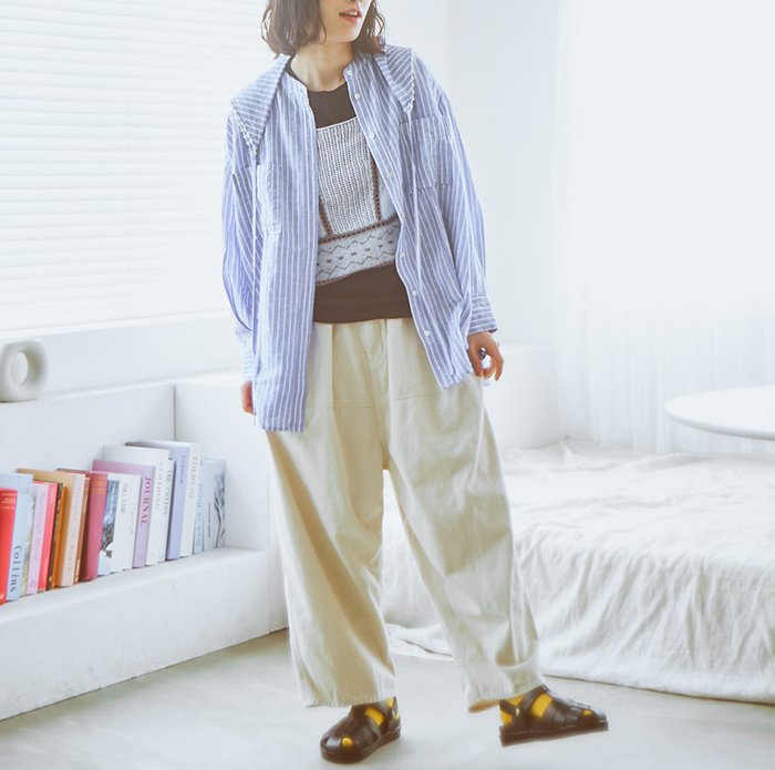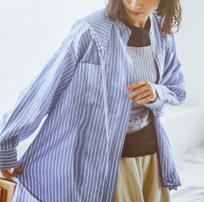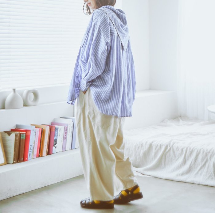 ストライプの端正な印象に、テンセル特有の「とろみ」と「落ち感」が加わることで、メンズライクになりすぎず、大人のこなれスタイルを叶える一枚に。