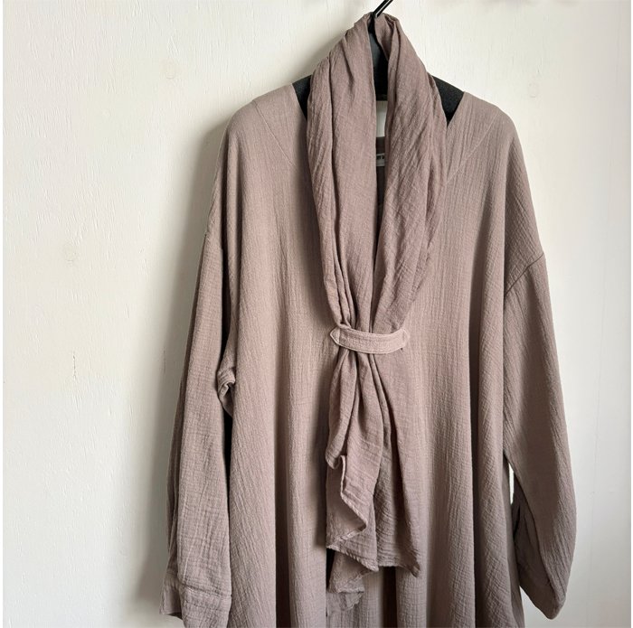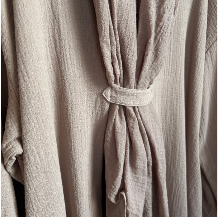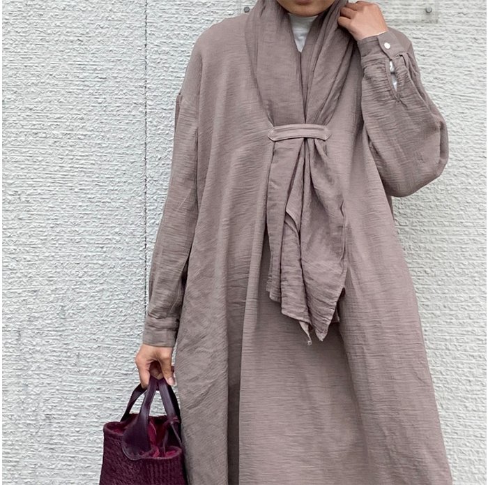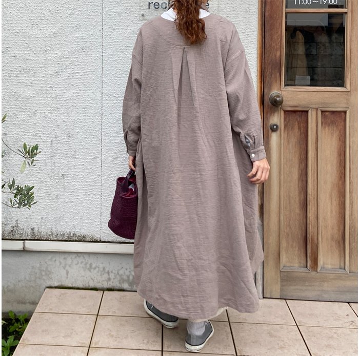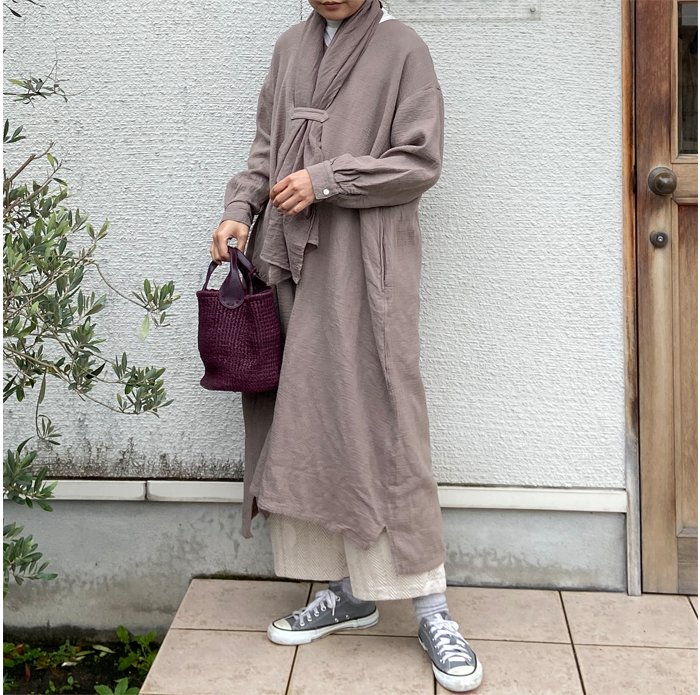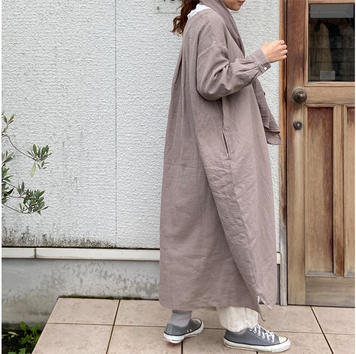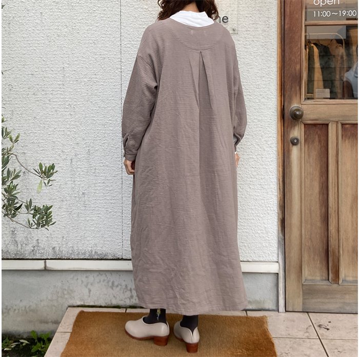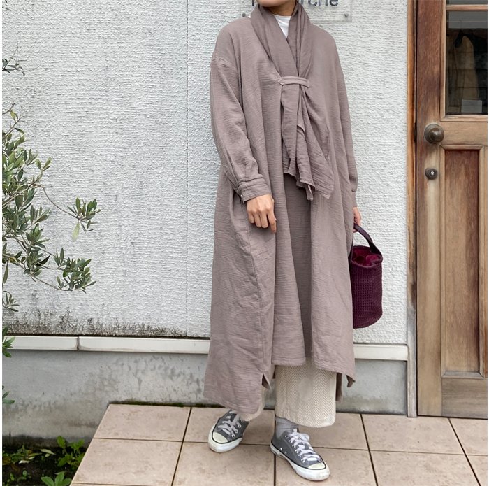 凹凸感のあるダブルガーゼ生地に、滋賀県・愛荘に伝統的に伝わる、近江晒(おうみさらし)という技法を施したこだわりの素材を使用したショール付きワンピース。