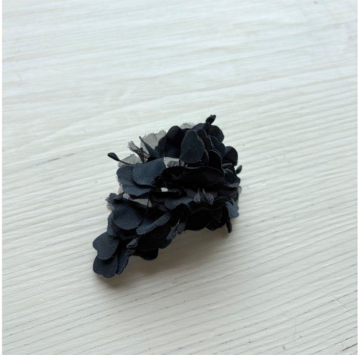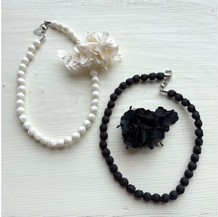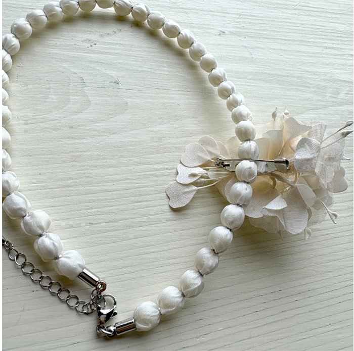 花弁パーツのブローチと、パールのような光沢のあるファブリックで包んだネックレスのsetアイテムです。