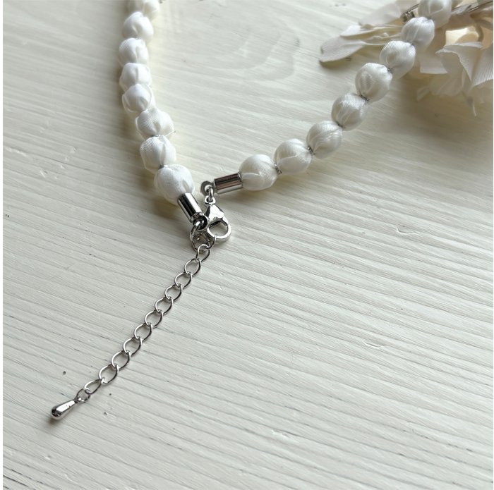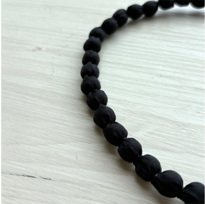 パールのようなシンプルな小粒ビーズに、光沢のある布を巻いて並べた印象的なネックレスは、カジュアルな装いにも合わせやすく使いやすいです。