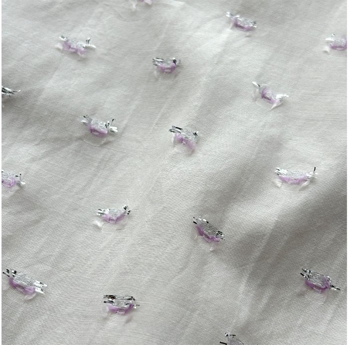 軽やかなコットンナイロンのベース生地に、ラメ糸とカラー綿糸を組み合わせてミニマルな飛び柄を表現。