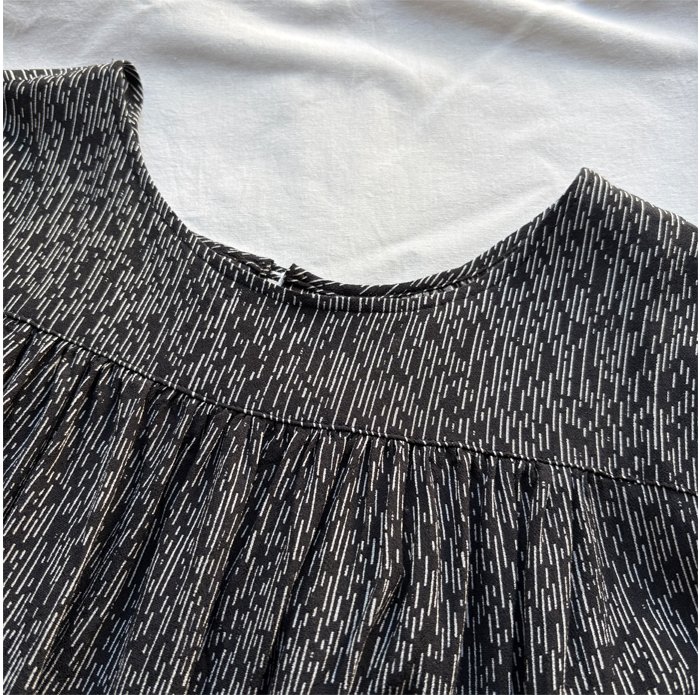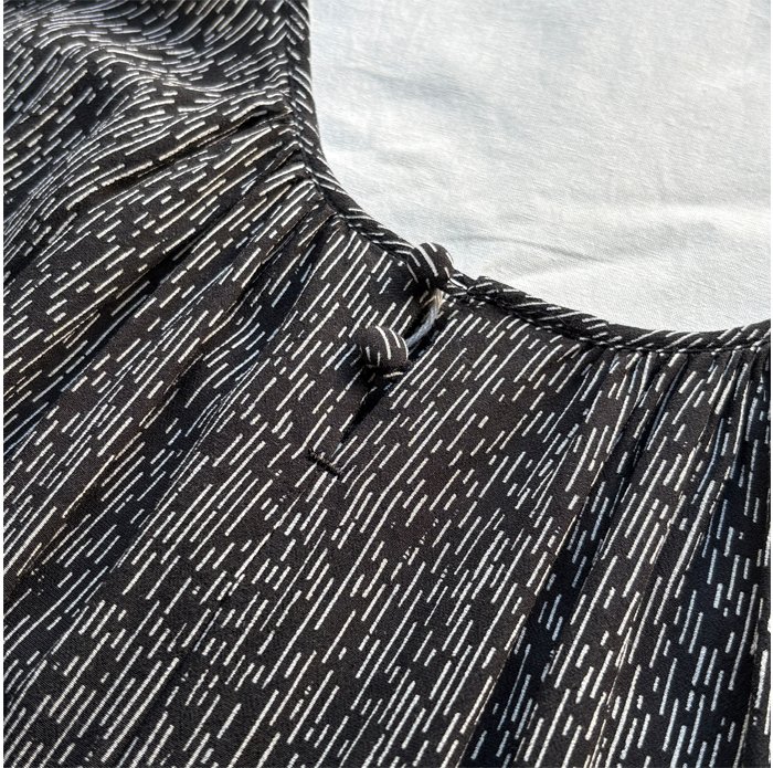 胸もとの切り替えから裾へと、たっぷりのギャザーを贅沢に重ねたティアードシルエット。